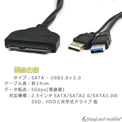 【商品仕様】 ・タイプ:SATA - USB3.0+2.0 ・ケーブル長:約14cm ・カラー:ブラック ・規格:外部電源不要(バスパワーで動作可能) ・対応機種:2.5インチHDD、SSDなど、動作時消費電力5W以下の機器 他 ※初期不良は交換いたします。