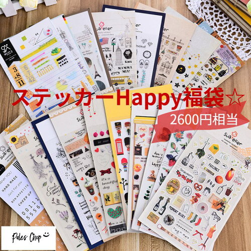 シール 10種 HAPPY 福袋 (s121) 総額2600円分 半額以下 ステッカー お得なセット 手描き風 海外名所 イラスト レトロ ナチュラル 箔押し スタンプ ハンコ ハート 星 花 韓国 雑貨 ライン おしゃれ 手帳 BUJO シール手帳 ノート 文具女子 新学期